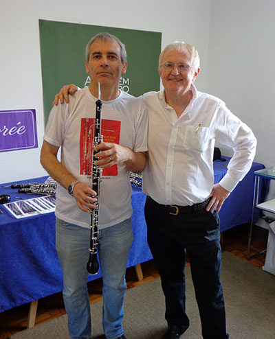 Visão geral da exposição Alain de Gourdon é um senhor simpático e de boa conversa, tive uma boa afinidade com ele que me convidou a conhecer a fábrica em Paris, houve a oportunidade de tratar muitos assuntos sobre a história do oboé, dos primeiros modelos produzidos pela empresa e sobre o mais antigo oboé Lorée que ele tem na coleção, um modelo em buxo com número de série A3, ou seja o terceiro oboé fabricado pela então recém criada empresa de fabricação de oboés ainda no ano de 1881. Confesso que fiquei curioso em ver uma foto deste oboé. Prometi a ele de enviar uma nova camiseta do site, para ele e para sua filha Marie-Léa.